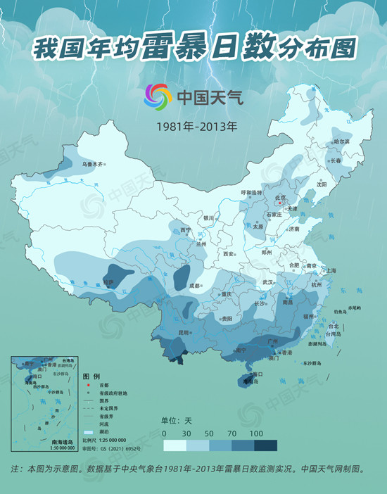 在气象上,一个观测站听到雷声的观测日就计为一个雷暴日。中国天气网研究了1981年至2013年我国各地雷暴日数的大数据发现,我国南方比北方更容易发生雷暴,山区雷暴日数多于平原。