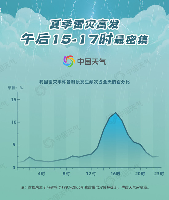 一天之中,我国各地的雷暴发生时间一般集中在午后到傍晚,15时至17时为最高峰。据中国气象科学研究院的统计数据显示,在1997年至2006年这10年间,雷灾事故的日变化特征呈现典型的单峰型,13时开始快速上升,15时至17时达到高值,16时达到峰顶,占比17.1%。