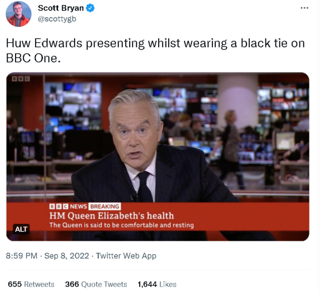 同时,他还发帖称BBC1台的新闻主播Huw Edwards在播报女王的健康新闻时打了一个黑色的领带。从他的截图来看,这名主播还穿了一身黑西装。
