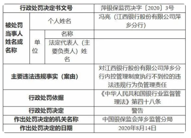 消息中还提及,员工冯亮因对江西银行股份有限公司萍乡分行内控管理制度执行不到位的违法违规行为负管理责任,中国银保监会萍乡监管分局根据《中华人民共和国银行业监督管理法》第四十八条,予以警告。
