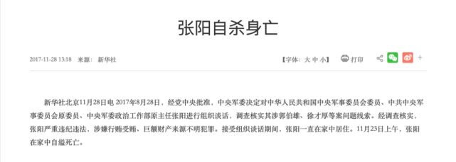 张阳,曾任中央军委政治工作部主任,涉嫌行贿受贿、巨额财产来源不明犯罪。2017年11月23日上午,张阳在家中自缢死亡。