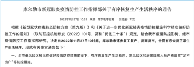 27日上午,库尔勒市发布通告,自11月27日10时起,全市低风险区居民在做好疫情防控措施前提下,有序恢复生产生活秩序。