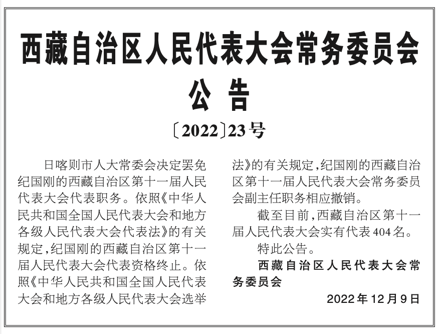 《西藏日报》最新报道,西藏自治区人民代表大会常委会12月9日发布公告,日喀则市人大常委会决定罢免纪国刚的西藏自治区第十一届人民代表大会代表职务,其代表资格终止。纪国刚的西藏自治区第十一届人民代表大会常务委员会副主任职务相应撤销。