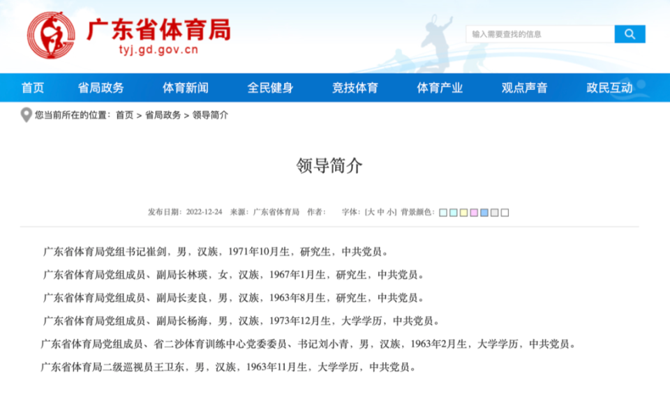 广东省体育局官方网站“领导简介”栏12月24日更新显示,崔剑担任党组书记。王禹平的名字已从该栏被撤下。