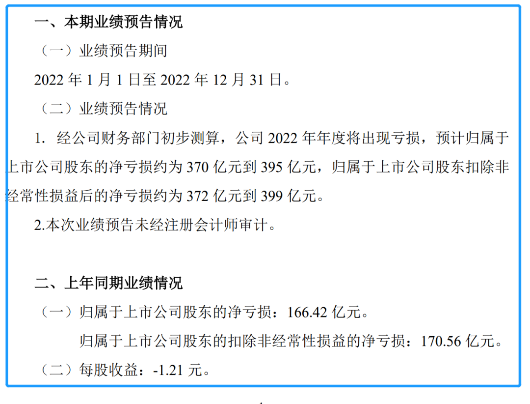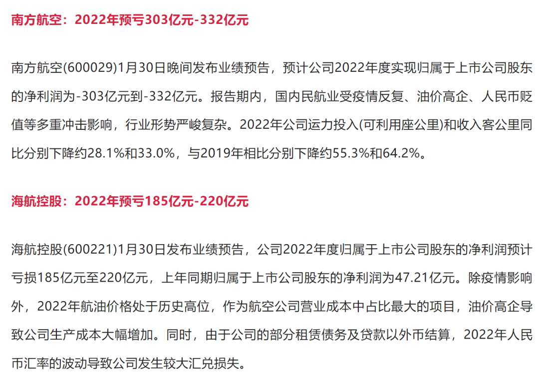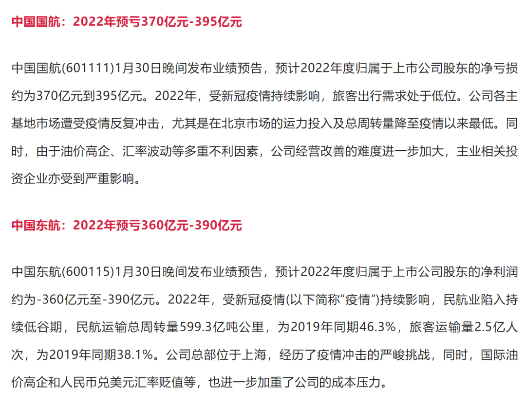 公告显示,中国国航预计2022年净亏损约370亿元至395亿元;中国东航预计2022年净亏损360亿元至390亿元;南方航空预计2022年净亏损303亿元至332亿元。
