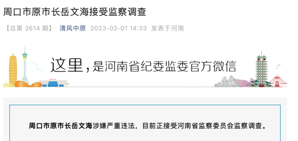 河南省纪委监委2月1日发布消息,周口市原市长岳文海涉嫌严重违法,目前正接受河南省监察委员会监察调查。
