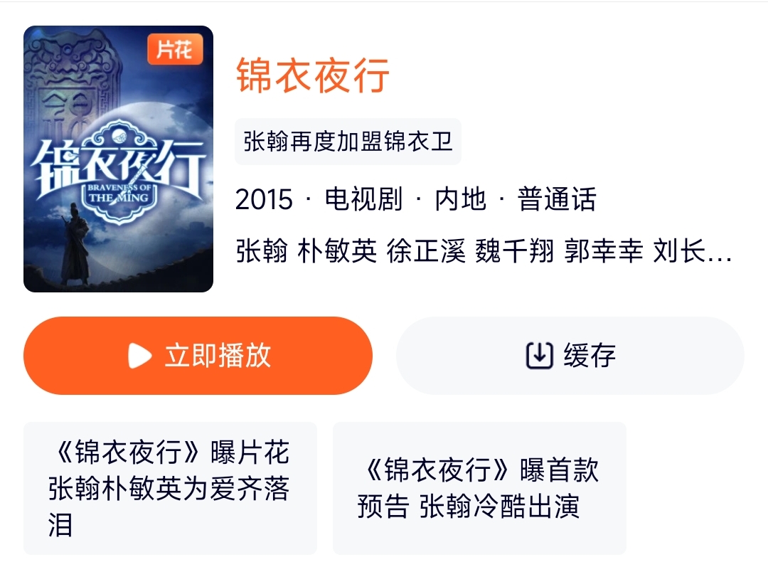 记者了解到,《锦衣夜行》是演员张瀚、朴敏英、徐正溪、宋妍霏、吴倩等主演的古装武侠剧,改编自知名作者月关的同名小说《锦衣夜行》,由上海剧芯文化创意有限公司、乐视网、贵州卫视联合出品,分为上下部,上部为《锦衣夜行》,下部为《锦衣飞龙》。