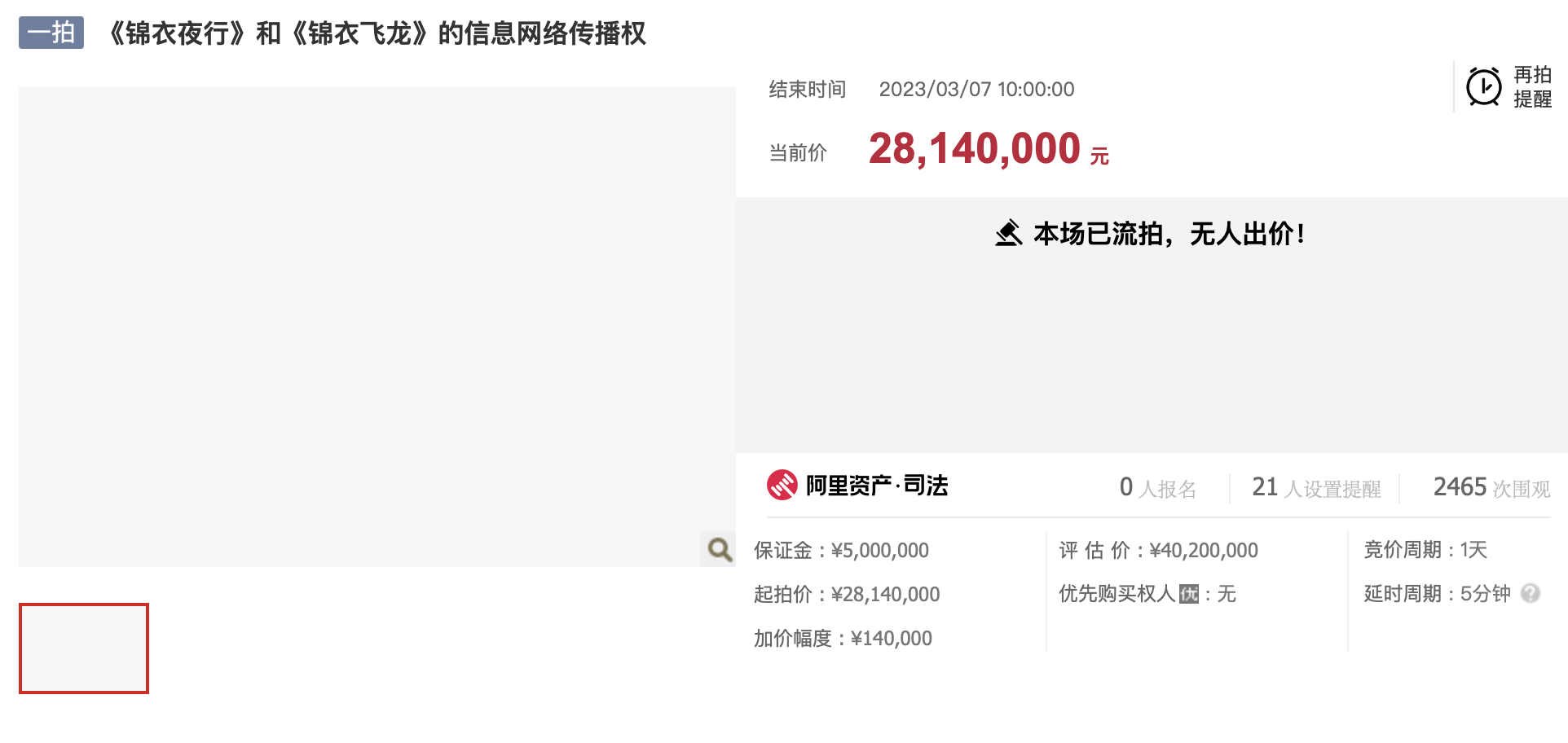 据拍卖信息显示,两部电视剧的评估价是4020万元,起拍价是2814万元,加价幅度14万元。拍卖期间,21人设置提醒,2000多人围观,但是最终还是因无人出价,商品被流拍。