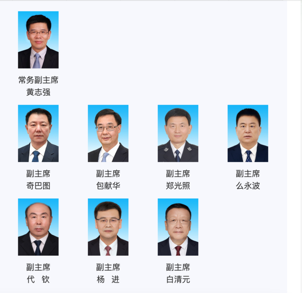 今年1月16日,内蒙古自治区第十四届人民代表大会第一次会议选举产生了新一届内蒙古自治区人民政府领导班子,黄志强、奇巴图、包献华、郑光照、么永波、代钦、杨进、白清元当选为自治区副主席。