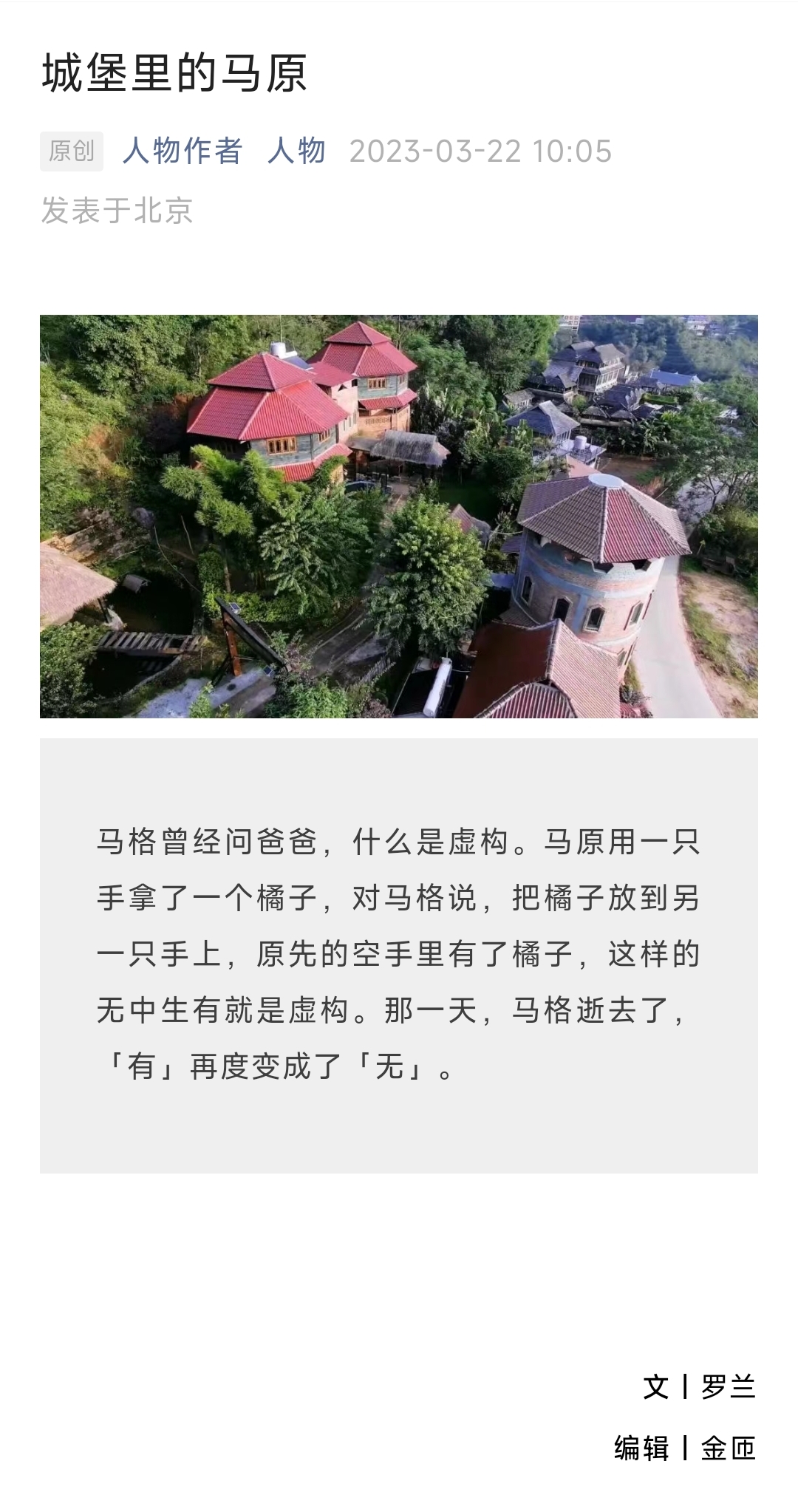 在这篇文章中,作者罗兰将马原描述成一个矛盾而又偏执的文人父亲——自己身患肺部肿瘤,不积极接受化疗,在高原上建起城堡,过着自然和诗意的日子;