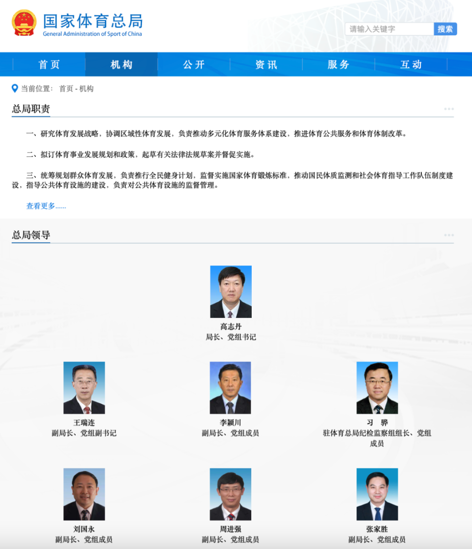 国家体育总局显示,除高志丹外,现任总局领导还有6人: