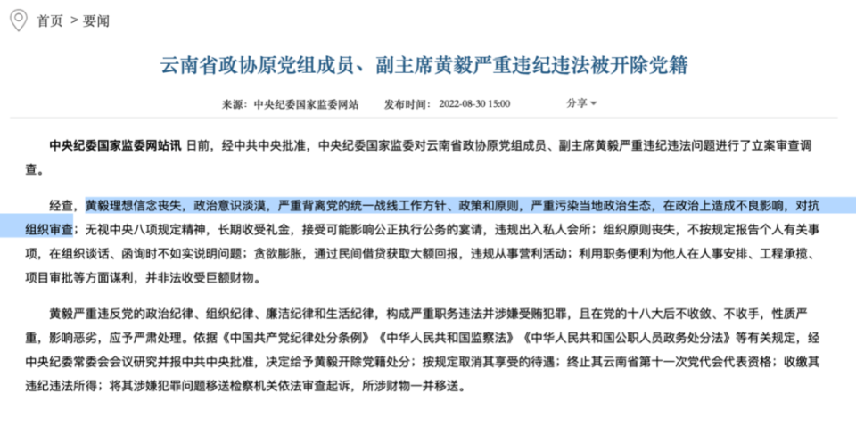 2022年3月24日,中央纪委国家监委发布消息,云南省政协原党组成员、副主席黄毅被查。