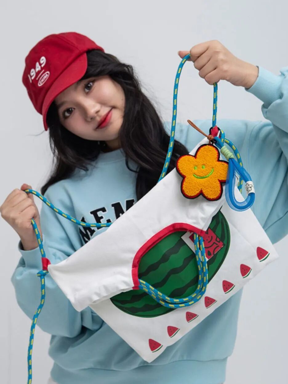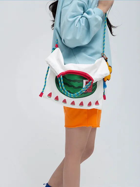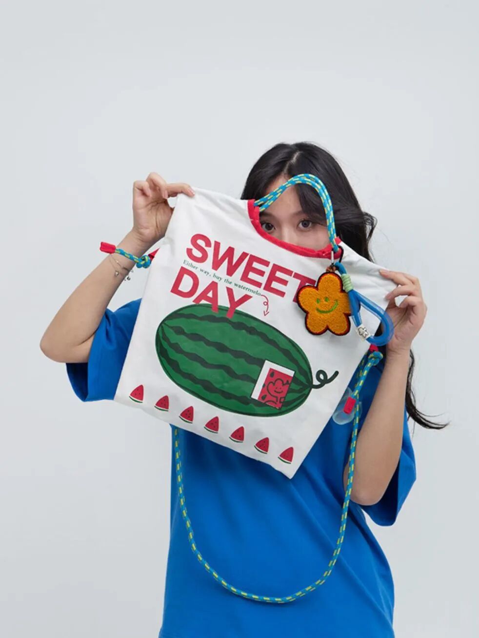夏天嘛就要换上夏日感一点的包包啦,这款包包有着超级可爱的西瓜印花,整体配色也很西瓜,边缘是西瓜红,包包上边还写着“sweet day”,代表着每天都跟西瓜一样甜呀!