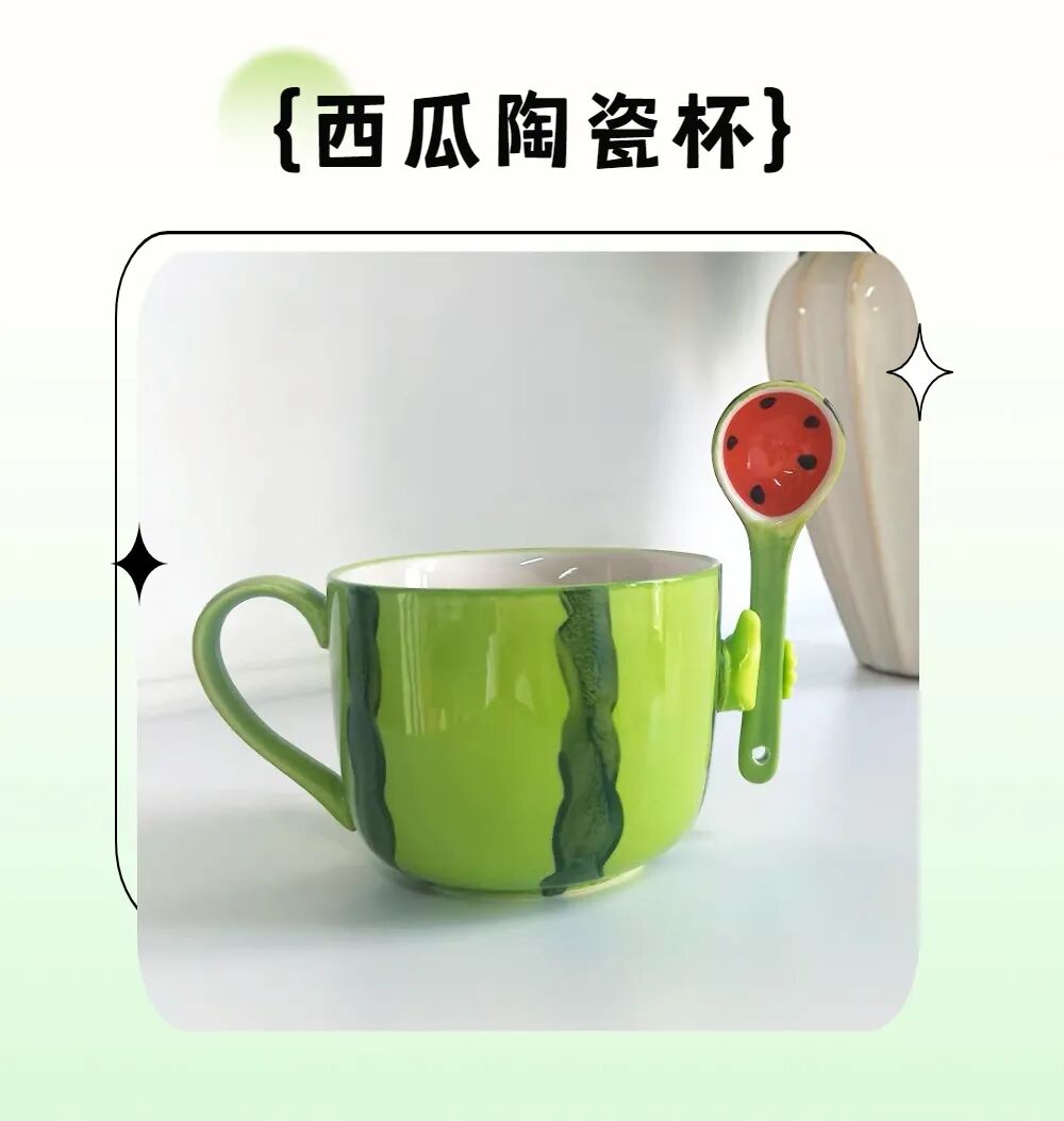你还可以搭配西瓜小勺子,它的造型致别致,勺子上还有凸起的西瓜籽,非常有立体感。如果你有那种总是忘记喝水的朋友,这款西瓜陶瓷杯是一份非常贴心的礼物,用这个杯子高低喝上好几口。