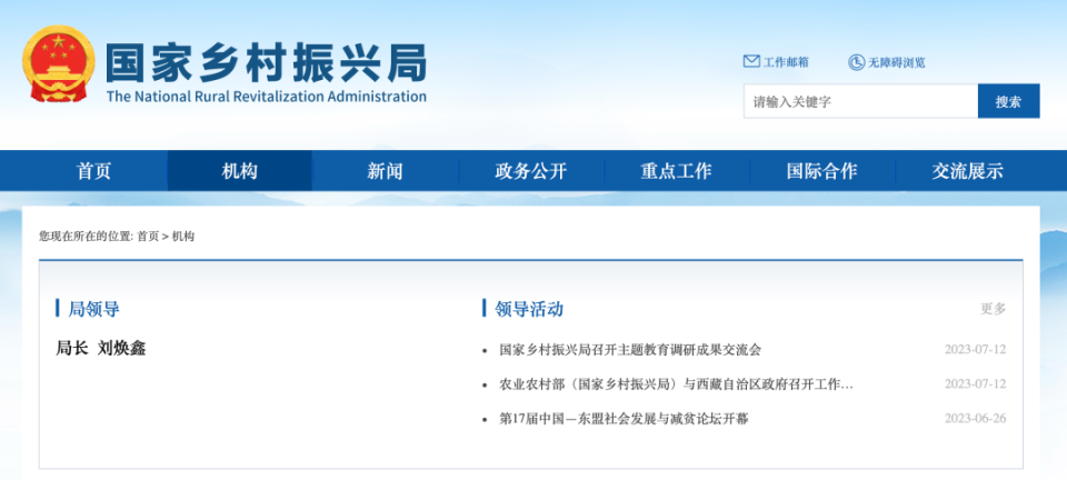 目前国家乡村振兴局的官网上,“局领导”一栏仅显示刘焕鑫一人。