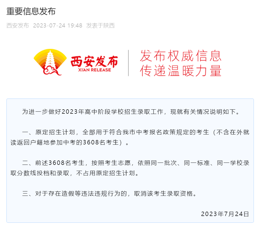 西安发布重要信息:3608名“回流生”不占用原定招生计划