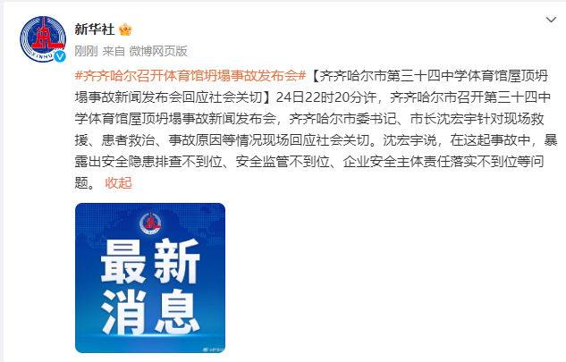 24日22时20分许,齐齐哈尔市召开第三十四中学体育馆屋顶坍塌事故新闻发布会,齐齐哈尔市委书记、市长沈宏宇针对现场救援、患者救治、事故原因等情况现场回应社会关切。沈宏宇说,在这起事故中,暴露出安全隐患排查不到位、安全监管不到位、企业安全主体责任落实不到位等问题。