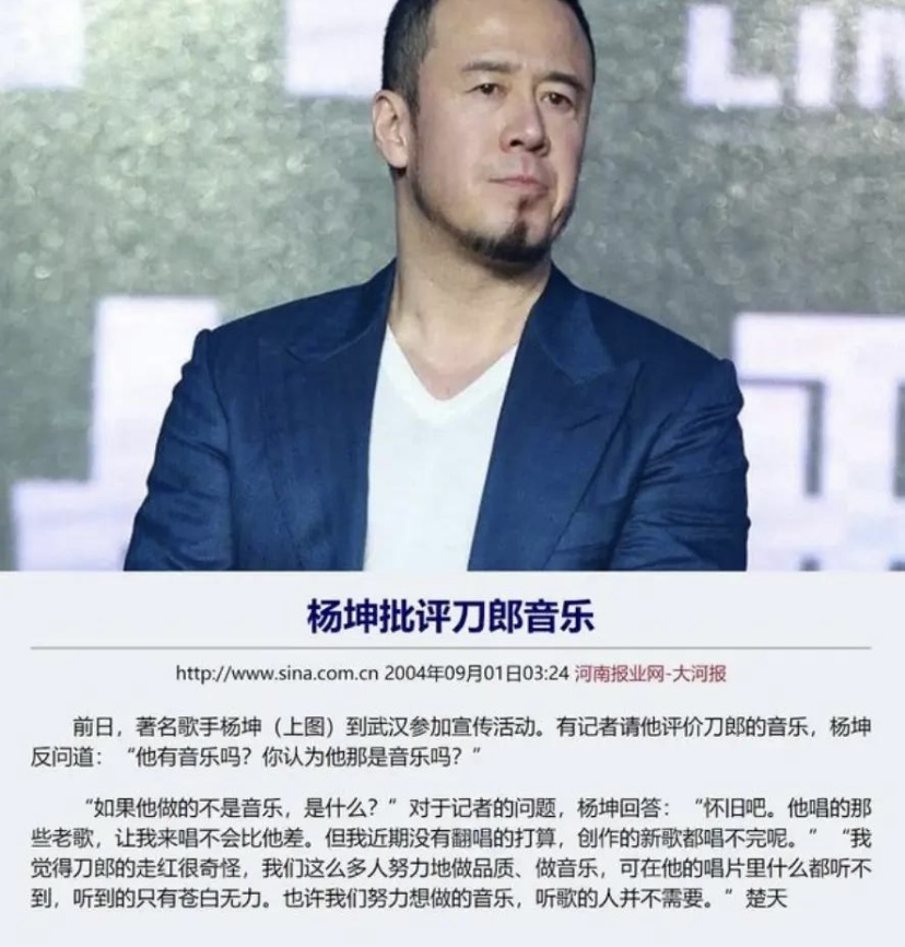 互联网有记忆,据网络资料显示,刀郎凭藉《2002年的第一场雪》走红全国,有记者请杨坤评价刀郎的音乐,此时杨坤反问记者道,“他有音乐吗?你认为他那是音乐吗?”