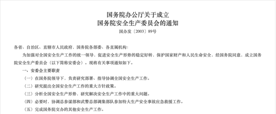当时的通知中提到,安委会的职责包括在国务院领导下,负责研究部署、指导协调全国安全生产工作;研究提出全国安全生产工作的重大方针政策等。