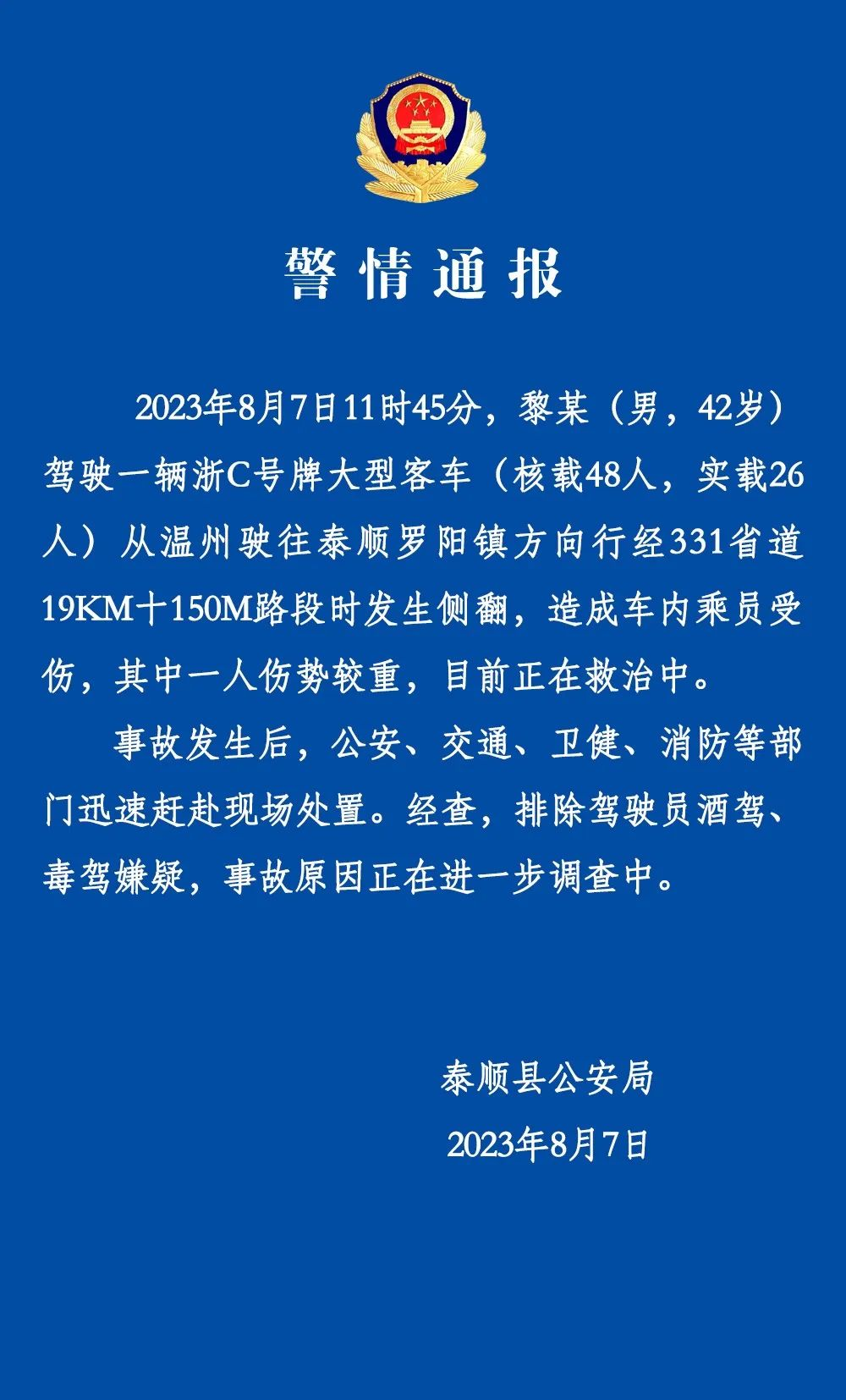 2023年8月7日11时45分,黎某 (男,42岁)驾驶一辆浙C号牌大型客车 (核载48人,实载26人) 从温州驶往泰顺罗阳镇方向行经331省道19KM+150M路段时发生侧翻,造成车内乘员受伤,其中一人伤势较重,目前正在救治中。