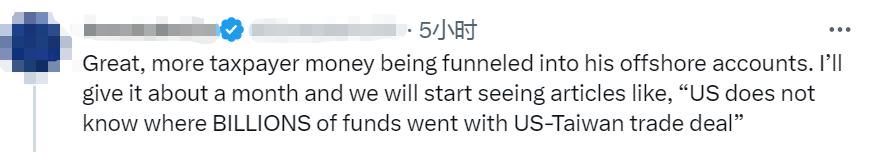 此外对于这一消息,有X平台(原推特)网民评论称,“太好了,更多纳税人的钱流入了他的海外账户。再过一个月,我们就会看到这样的文章,‘美国不知道数十亿美元的美台贸易资金去了哪里’”。↓