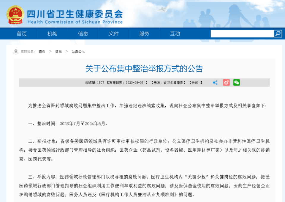 近日,北京、重庆、海南、云南、四川等多地省级卫健委公布医药领域腐败问题集中整治举报方式。