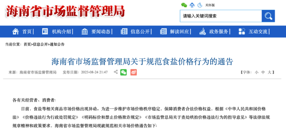 政知君注意到,海南省市场监督管理局24日发布《关于规范食盐价格行为的通告》。