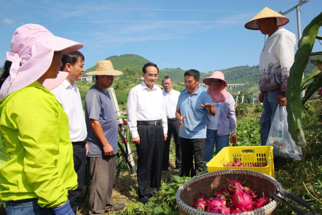 图为徐麟在沫阳镇沫阳村火龙果种植基地,深入田间地头察看火龙果收成,与务工群众交流