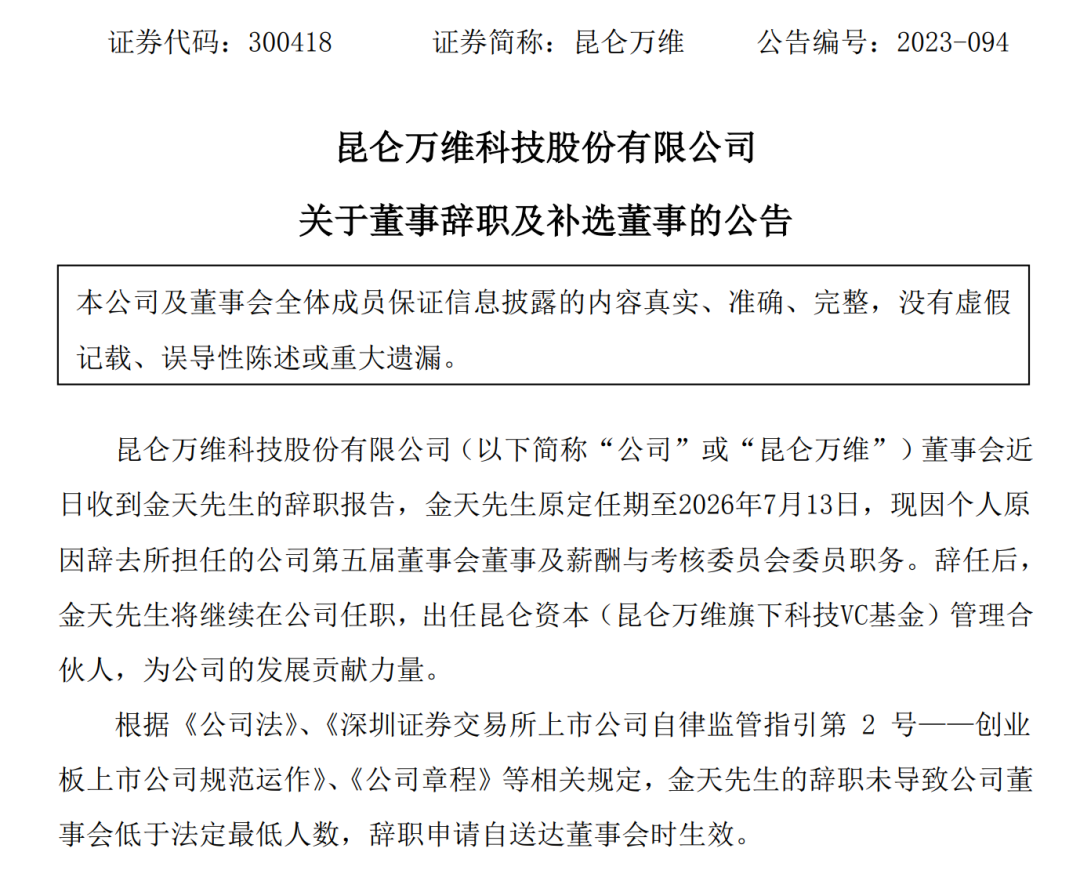 因个人原因,金天申请辞去公司董事长职务。辞任后,金天将继续在公司任职,出任昆仑资本(昆仑万维旗下科技VC基金)管理合伙人。