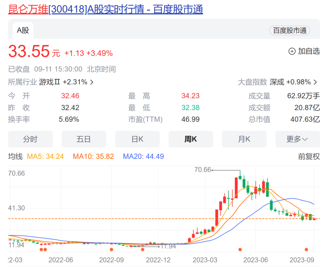 但很快,昆仑万维再次交出了下滑的业绩单:今年上半年,公司实现营收24.25亿元,同比上涨7.83%;归母净利润3.58亿元,同比下降44.31%。昆仑万维的股价也随之下探。