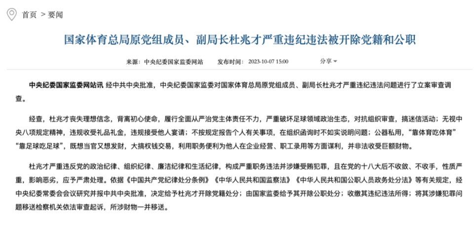 纪委通报称,杜兆才“严重破坏足球领域政治生态”。