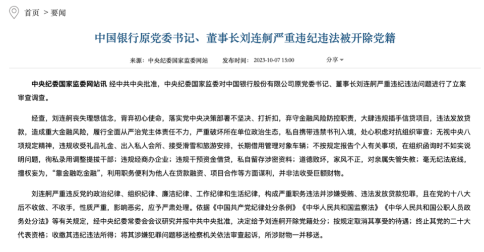 今年2月17日,刘连舸被免去中国银行党委书记职务,当时,不少业内人士认为,刘连舸可能会“出事”。3月31日,靴子落地,刘连舸被查。