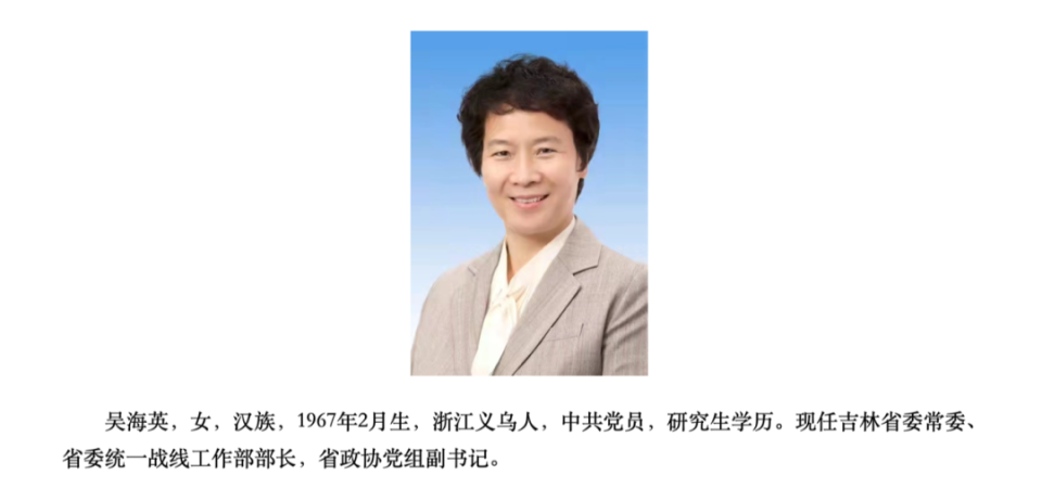 10月,吉林省委常委、统战部部长吴海英(女)任吉林省委副书记