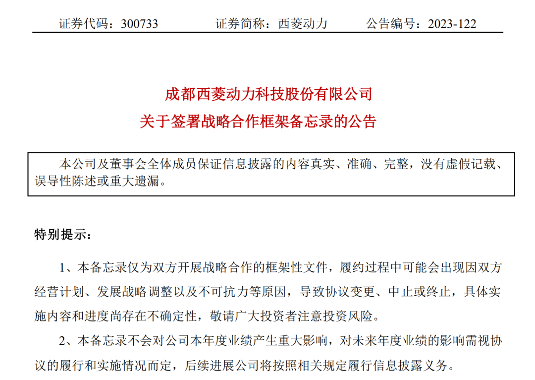 根据合作备忘录,西菱动力与本奥米尔将共同出资设立新平台公司,其中在中国境内成立新能源汽车零部件合资公司SPV1,在中东地区成立新能源汽车零部件合资公司SPV2。