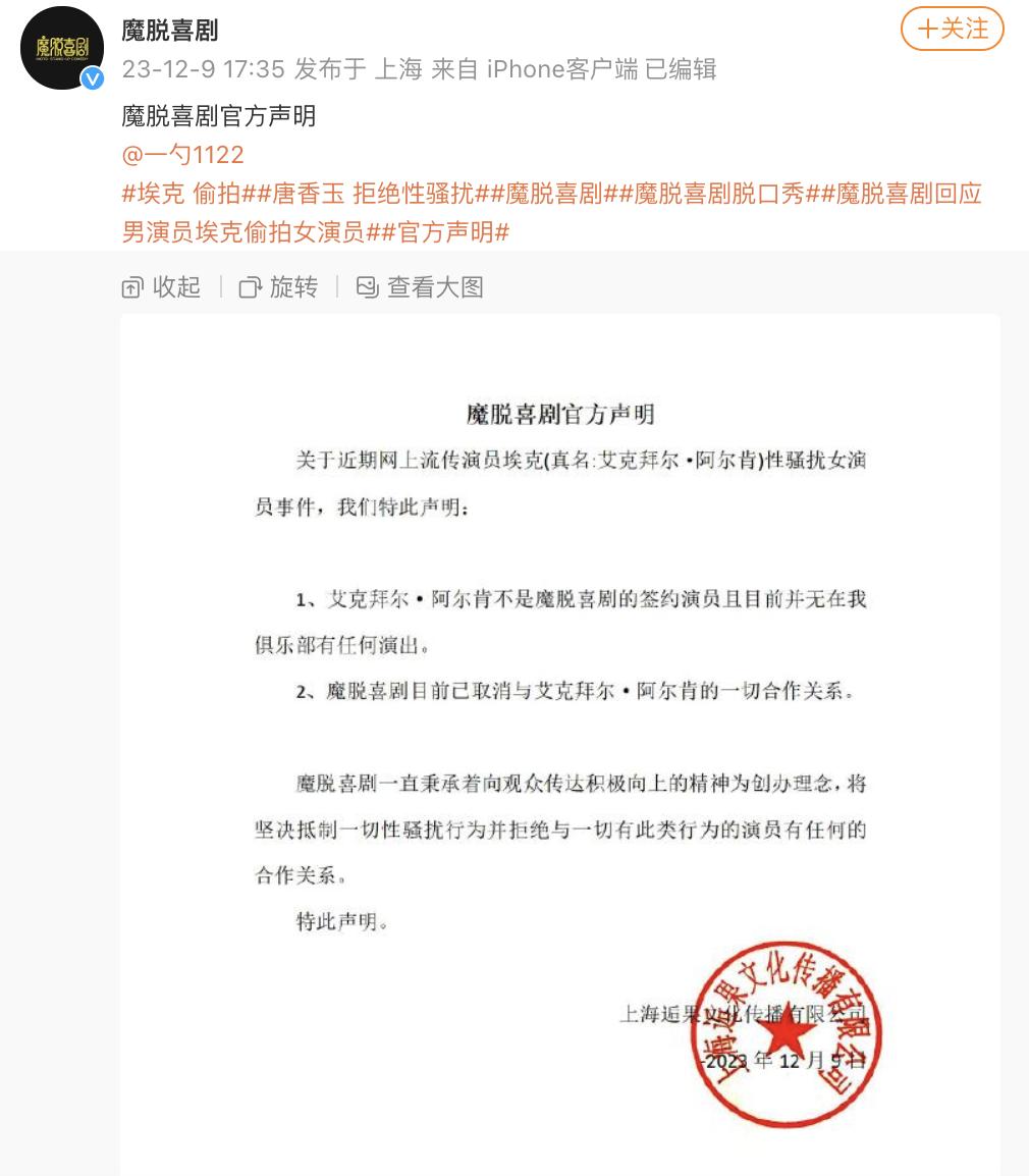9日下午,@魔脱喜剧 微博发布官方声明: