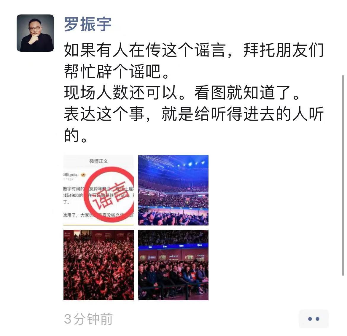 风口变了吗?1月2日,有博主发文称,罗振宇跨年演讲上座率不到三分之一,内场票在开场前暴跌,黄牛亏麻了。对此,罗振宇本人通过朋友圈予以否认,表示如果有人在传这个谣言,拜托朋友们帮忙辟个谣吧,现场人数还可以。