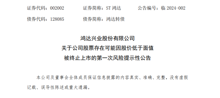 1月4日晚间,ST鸿达首次披露“面值退市”风险提示性公告。