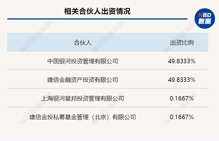 其中,出资比例较少的两家公司上海银河星邦投资管理有限公司、建信金投私募基金管理(北京)有限公司为该企业执行事务合伙人。进一步看,前者是中国银河投资全资子公司,后者是建信投资全资子公司。