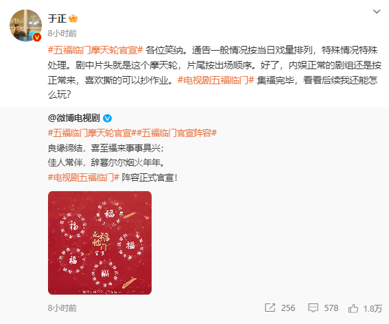 18日,于正新剧《五福临门》官宣了演员阵容。引起热议的是官方微博文案中没有出现任何一个演员的名字,演员阵容海报更是出了个“怪招”,所有演员的名字连成了五个环形绕着片名旋转,还特别在海报上注明“旋转方向不分上下左右”,发布的预告海报上也不见明星的肖像和名字。为了躲开明星的名字顺序、图像大小、前后位次等可能引起的争议的点还真是煞费苦心,叫人哭笑不得。于正发微博表示:“影视打工人太不容易,平台需要明星,明星需要一番,一番只有一个,不对等咖位又不愿意做配,咋办呀?转起来!”