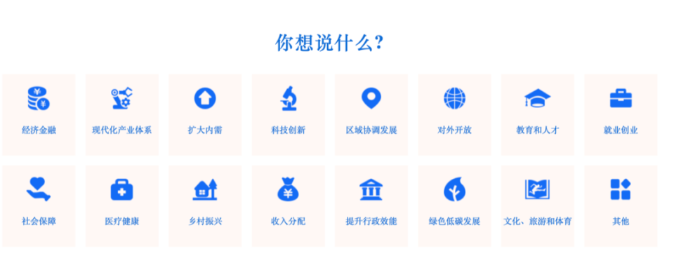 “经济金融”“现代化产业体系”“扩大内需”“科技创新”“对外开放”“教育和人才”“就业创业”“社会保障”“医疗健康”“乡村振兴”“提升行政效能”等。