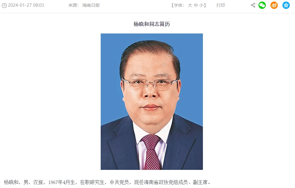 政知君注意到,海南省政府网已更新,杨晓和现任海南省政协党组成员、副主席。