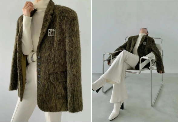 第一套魅力高级风,橄榄色的毛呢西装外套,厚实保暖,自带柔雾哑光感长毛绒,中和了西装面料的疏离感,将西装版型与日常感穿搭完美融合,既能凸显干练的职场女性气场,又能尽显时尚感,如同电视剧中职场俏佳人走进现实。