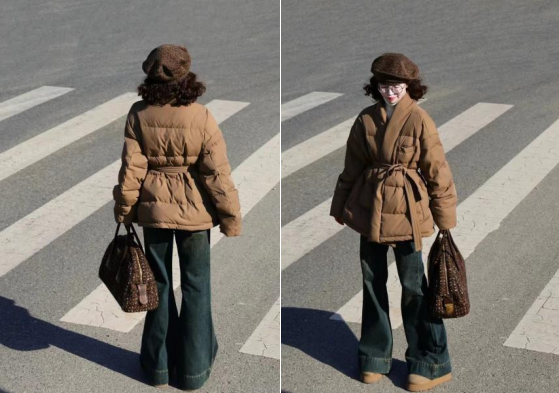 第二套法式精干风,棕色收腰V领羽绒服,充满法式小情调,通勤路上保暖还不失时尚,新年复工更显精神,活力满满开启新一年的工作。