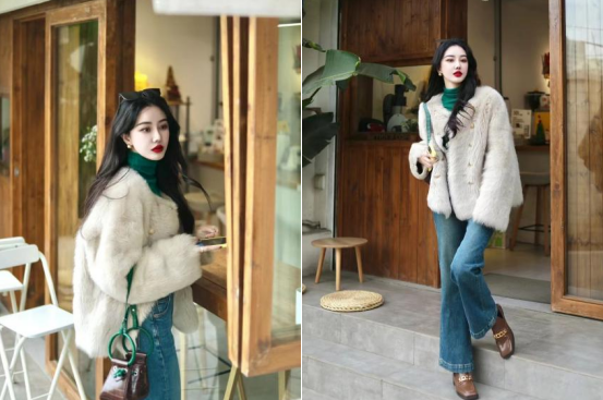 第一套休闲感皮草,米白色的皮草内搭深绿色打底衫配蓝色牛仔裤,整体感觉更加随和,弱化了皮草的贵气感带来的疏离,适合上班通勤,不仅保暖还贵气时髦。