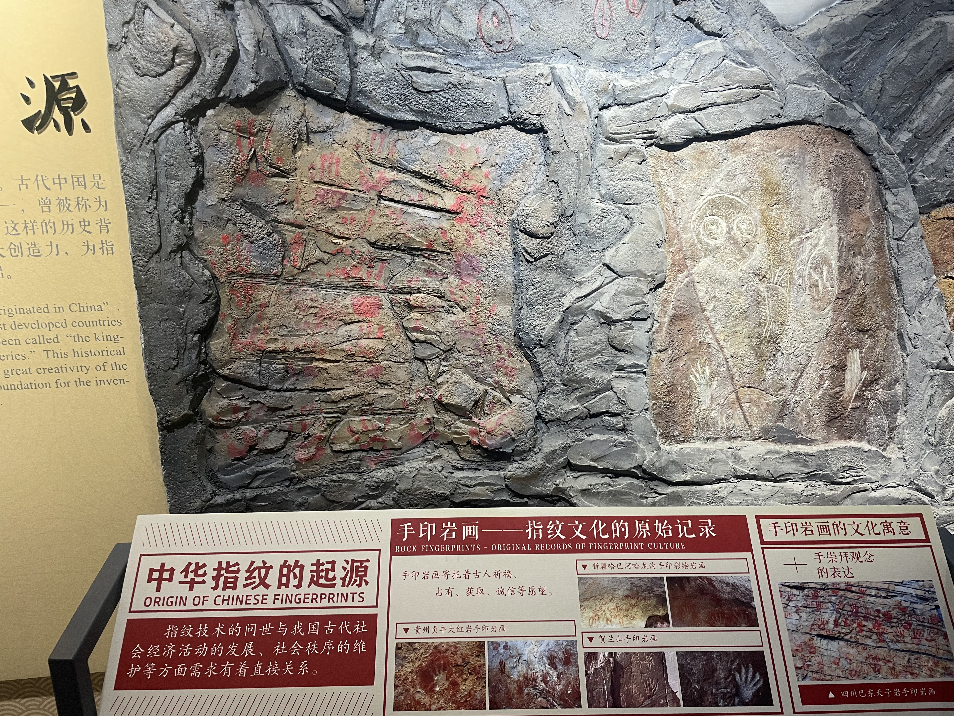 进馆第一眼就能看到复原的新疆昆仑山手印岩画,这幅画距今已有万年,画中除了牛羊的形象外,还有印上去的手印,研究认为早在万年前人类就意识到每个人的手各不相同,并以此作为猎物占有的凭证。在战国时期,人们开始在文书传递中使用封泥,这起到防伪和保密的作用,官方文书封泥普遍加盖印章,而私人文书中人们会在封泥上按上指纹,以此表明身份,在馆中珍藏指纹封泥记录着这一传统。