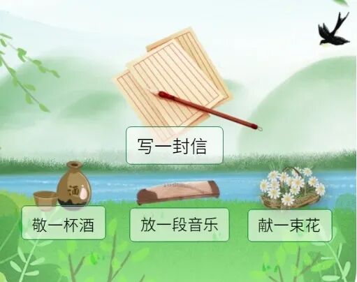 您可选择为故人敬一杯酒、献一束花、放一段音乐或写一封信的方式进行文明祭扫。