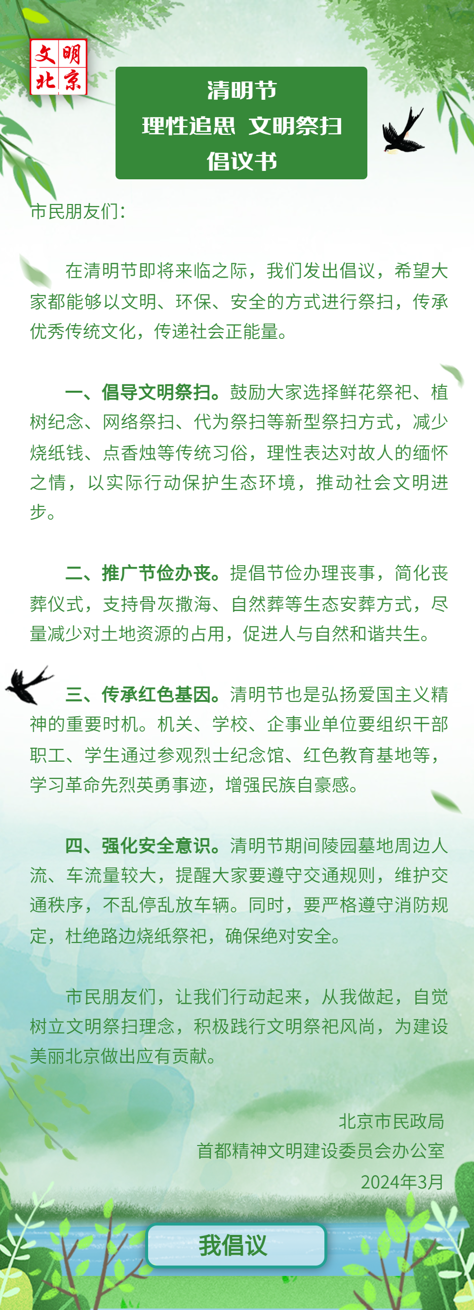 又是一年清明际,又是追念故人时。在这缅怀先辈、寄托哀思的重要时节,“文明北京”开展“寄情在云上,追思在心间”清明节线上云祭扫活动。让我们倡导文明祭扫新风尚,过一个绿色、平安、健康的清明节!