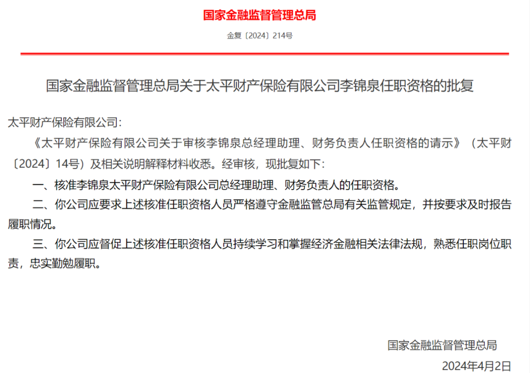 日前,国家金融监督管理总局发布关于太平财产保险有限公司李锦泉任职资格的批复。核准李锦泉太平财险总经理助理、财务负责人的任职资格。