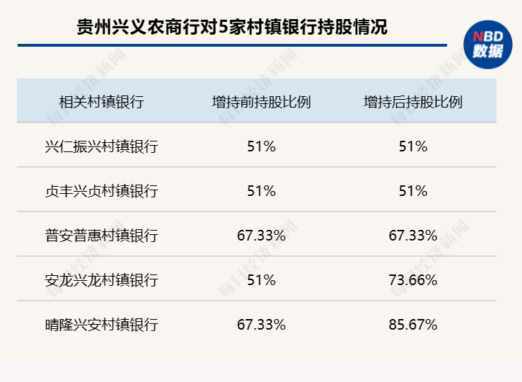 公开资料显示,截至2022年末,贵州兴义农商行作为主发起行,旗下拥有包括上述两家村镇银行在内的5家村镇银行。此次受让完成后,贵州兴义农商行对这两家村镇银行的持股比例分别增至85.67%、73.66%。