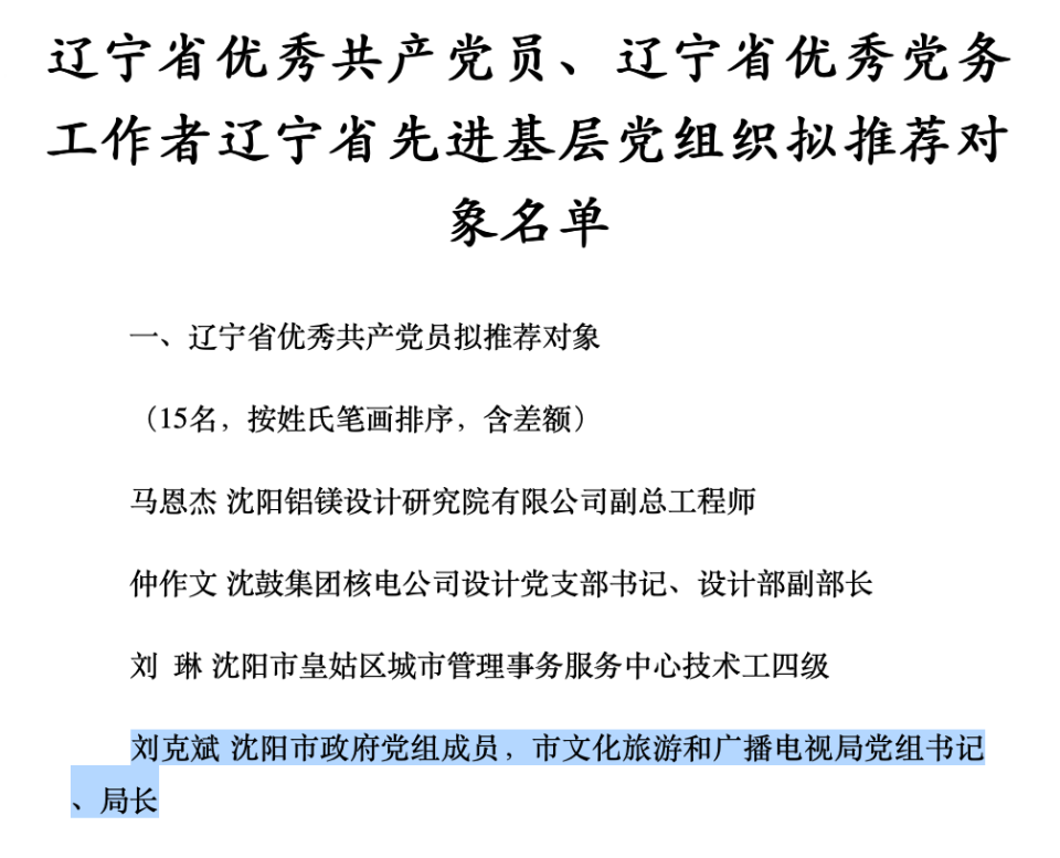 此前,5月15日,沈阳市委组织部发布一则干部任前公示:沈阳市文化旅游和广播电视局党组书记、局长刘克斌拟进一步使用。